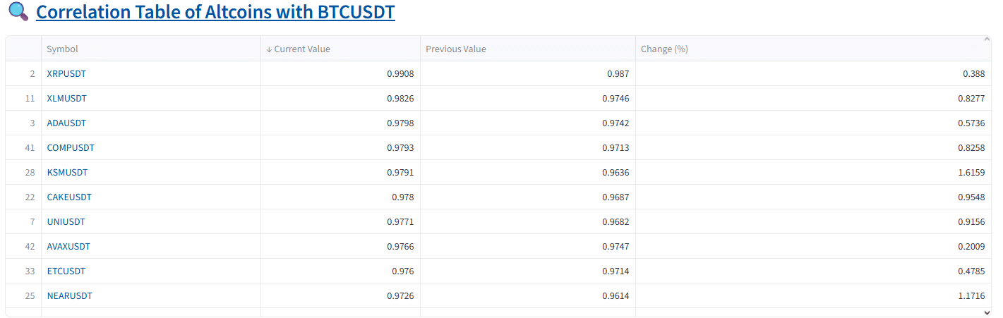 Ripple ist ein Paradebeispiel. Trotz solider Zuflüsse folgt der Preis weitgehend den Bewegungen von BTC. Tatsächlich liegt XRP, wie die Grafik zeigt, mit einem Wert von 0,998 an der Spitze der Tabelle und ist damit der am stärksten von BTC abhängige Altcoin.
