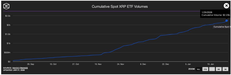 Noch beeindruckender ist, Spot-XRP-ETFs erzielten Rekordhandelsvolumina trotz des allgemeinen Abwärtstrends. Daten von The Block zeigt dass das kumulierte Volumen der XRP-ETFs nur einen Tag nach dem täglichen Abfluss von 92,9 Millionen US-Dollar von 2,15 Milliarden US-Dollar auf 2,23 Milliarden US-Dollar stieg. Berichten zufolge hatte der XRP ETF von Bitwise zu diesem Zeitpunkt das höchste Handelsvolumen, gefolgt von Grayscales GXRP, Franklin Templetons XRPZ, Canarys XRPC und 21Shares TOXR, in dieser Reihenfolge.