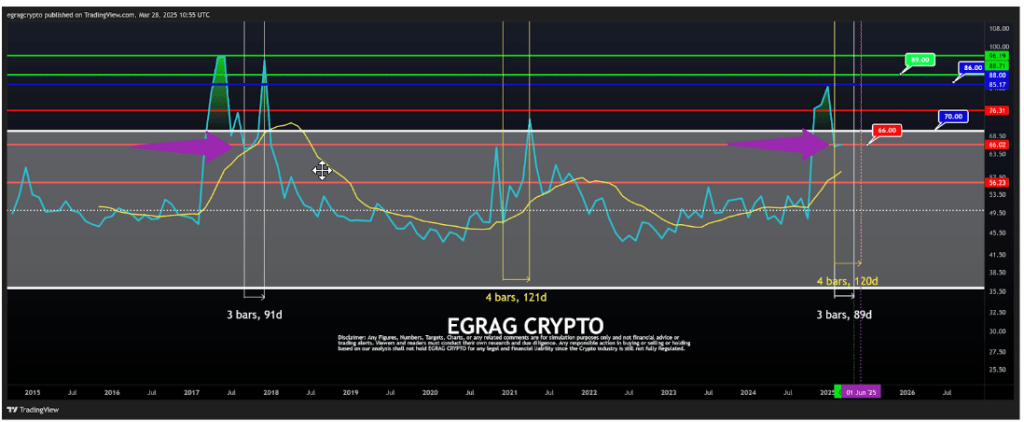 Bisher hat XRP in diesem Zyklus bereits seinen ersten RSI -Peak abgeschlossen. so hoch erreichen Als 85,17 gegen Ende 2024. Anschließend war der RSI in einer langen Abklingzeit -Phase und fährt zum Zeitpunkt des Schreibens auf ein Tiefpunkt von 65. Der RSI sitzt rund 66 und von hier aus wird ein Springerort erwartet, was irgendwann im Juni einen Höhepunkt im Juni erreichen soll.