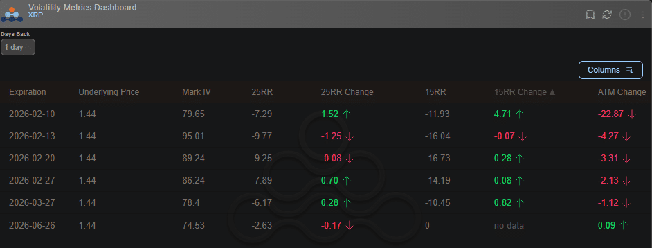 Dies lässt sich am 25-Delta Risk Reversal (25RR) veranschaulichen. Zum Zeitpunkt des Verfassens dieses Artikels war es negativ mit Werten zwischen -7 und -10 für die nächsten Optionsabläufe. Hier deutete es auf eine größere Nachfrage nach Puts (Absicherung gegen Abwärtsrisiken) als nach Calls (bullische Wetten) hin.