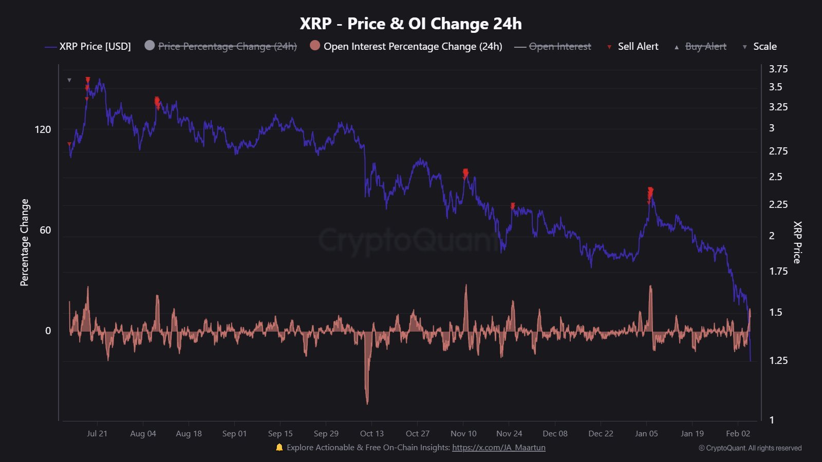- XRP sinkt, während das Open Interest um +12 % zunimmt, was eher auf eine Ausweitung der Hebelwirkung und eine zunehmende Marktfragilität als auf eine Spot-getriebene Akkumulation hindeutet.