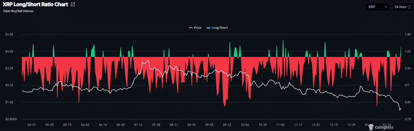 Das lange/kurze RVerhältnis fügt weiteren Kontext hinzu. Die Dominanz der Verkäufer bleibt über mehrere Intervalle hinweg sichtbar, wobei das Verkaufsvolumen der Abnehmer den Kaufdruck übersteigt, während die Preistrends nachlassen.