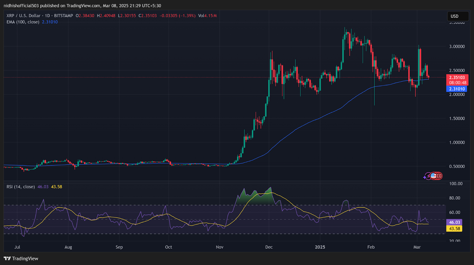 Alle Augen sind nun auf dem Ort, an dem XRP vor seiner optimistischen Umkehrung möglicherweise nach unten kommt. Das bullischste Szenario ist, wenn es von seiner 100-Tage-EMA abprallt, ein gleitender Durchschnitt, den es zum Zeitpunkt der Presse testet.