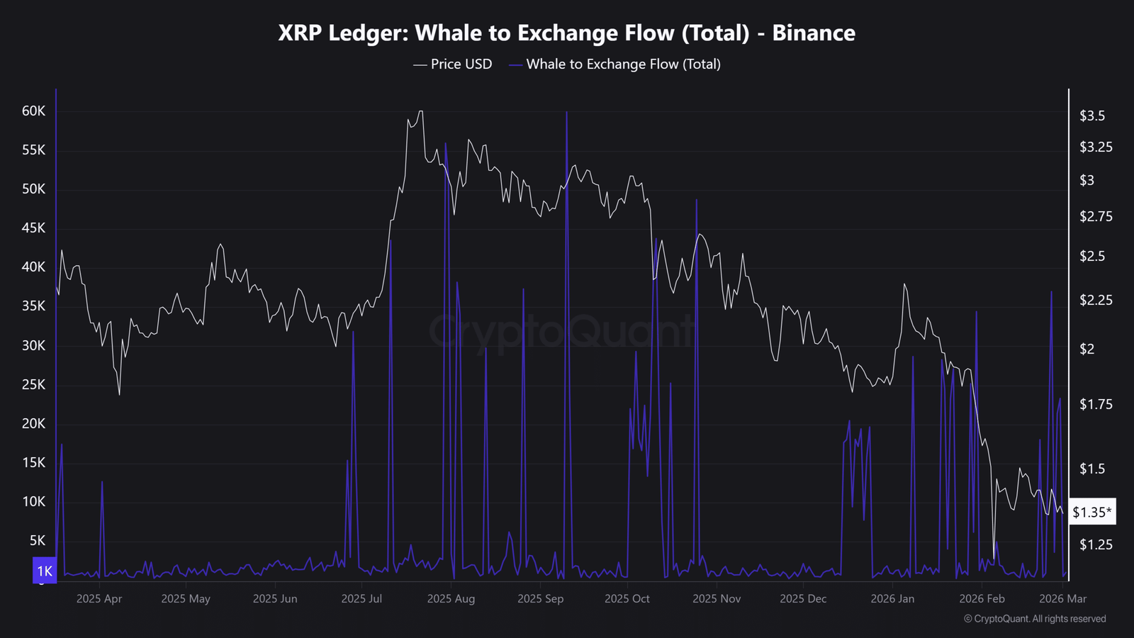Gleichzeitig fiel der XRP von über 2,50 $ auf etwa 1,30 bis 1,40 $ zurück, was darauf hindeutet, dass Einlagen während der Preisschwäche erfolgten.
