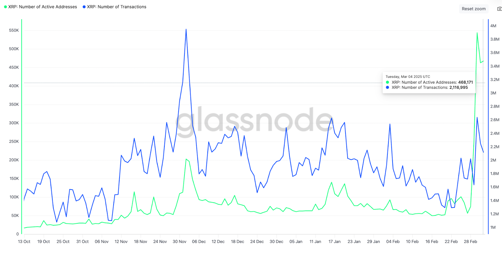 XRP -Anleger nutzten die niedrigeren Niveaus und sammelten mehr zu ermäßigten Preisen. Onchain -Daten von der Market Intelligence -Firma GlassNode zeigen, dass aktive XRP -Adressen in der vergangenen Woche um satte 680% gestiegen sind und von 59.900 am 27. Februar auf 468.171 am März gestiegen sind. 4.