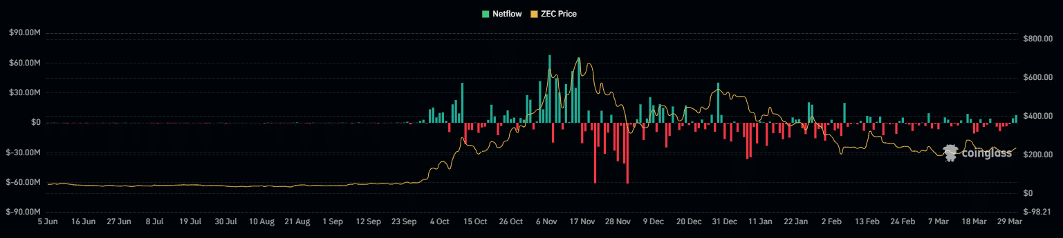 Wenn die Bullen einen Ausbruch über den Keil bei etwa 233 US-Dollar schaffen, könnte ZEC in eine Expansionsphase eintreten und in Richtung des nächsten Widerstands bei etwa 289 US-Dollar ansteigen. Starke Zuflüsse und Walunterstützung würden diesen Schritt unterstützen.