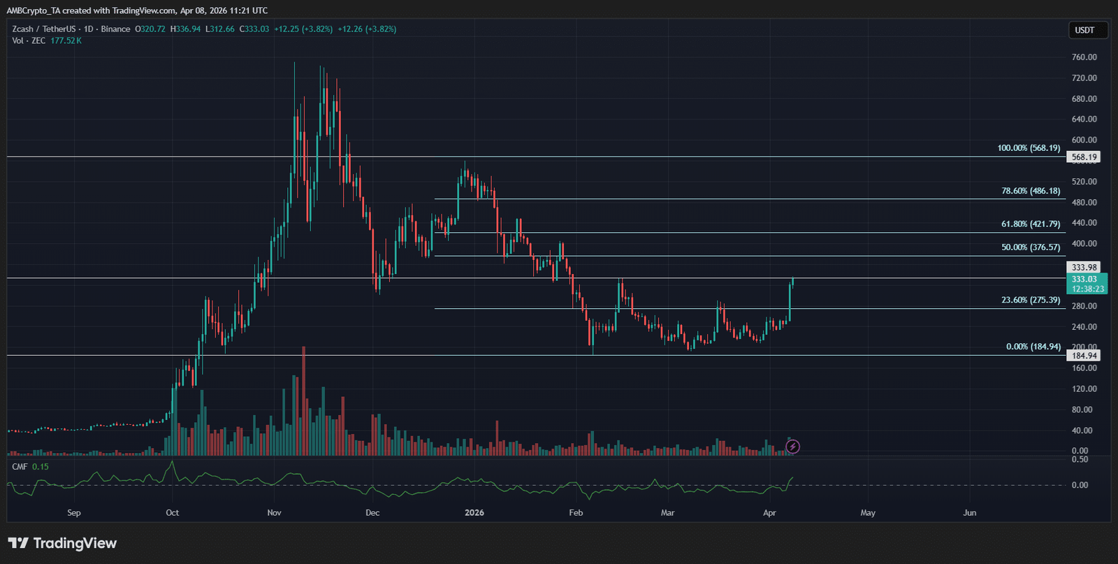 Zcashs Die Preisbewegung verstärkte sich, da die Dynamik mit der steigenden Aktivität übereinstimmte. Erstens erholte sich ZEC von der Basis von 184 US-Dollar und durchbrach die Marke von 275 US-Dollar, wobei er die Marke von 23,6 % zurückeroberte und eine Trendumkehr signalisierte.