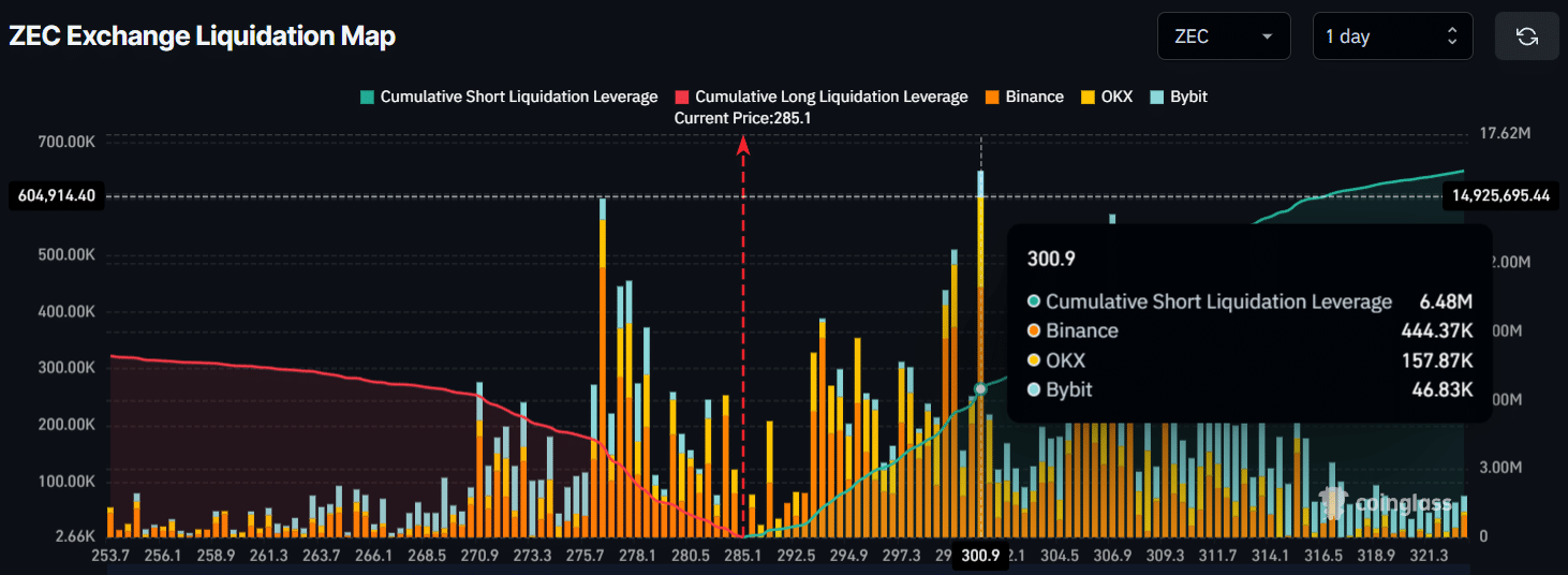 Zcash [ZEC] ist zum Zeitpunkt der Drucklegung um 4,50 % gefallen und wurde bei 283,50 $ gehandelt. Dies signalisiert die mögliche Fortsetzung seiner Abwärtsdynamik.
