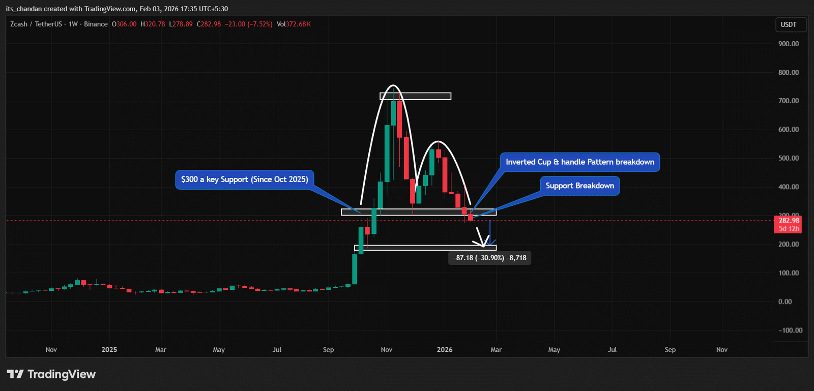 - Zcash hat die wichtige 300-Dollar-Unterstützung durchbrochen und die Preisentwicklung deutet darauf hin, dass ein weiterer Rückgang um 30 % in Sicht sein könnte.