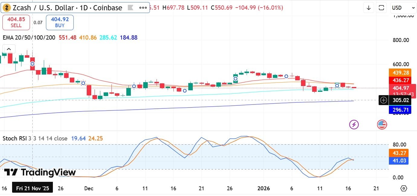 Gleichzeitig fiel ZEC unter seine kurzfristigen gleitenden Durchschnitte, wobei die 20- und 50-Tage-EMAs den Abwärtsdruck weiter bestätigten.