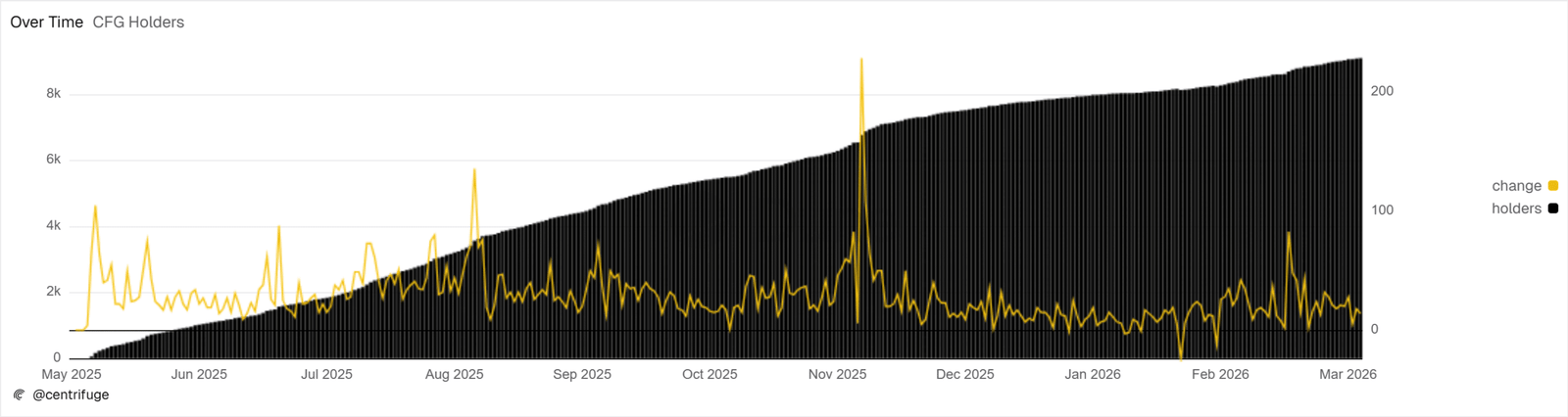 Dune Analytics aufgezeichnet insgesamt 19.699 eindeutige Adressen, die mit CFG interagieren. Darüber hinaus sind die Inhaberzahlen seit Mai 2025 von Tag zu Tag gewachsen.